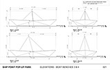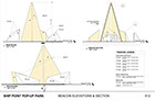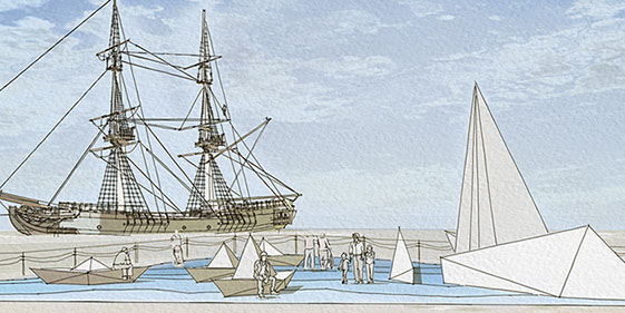Whimsical and evocative, the winning design for the Ship Point Pop Up Design Competition in Victoria by Marie-Claude Fares & Peter Carter scales up childhood paper boats to oversized sculptures that draw people to the area, creating a vibrant space for exploring and relaxing.