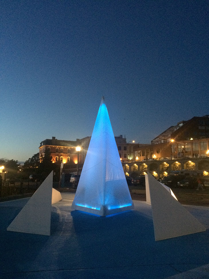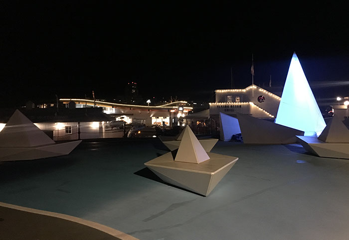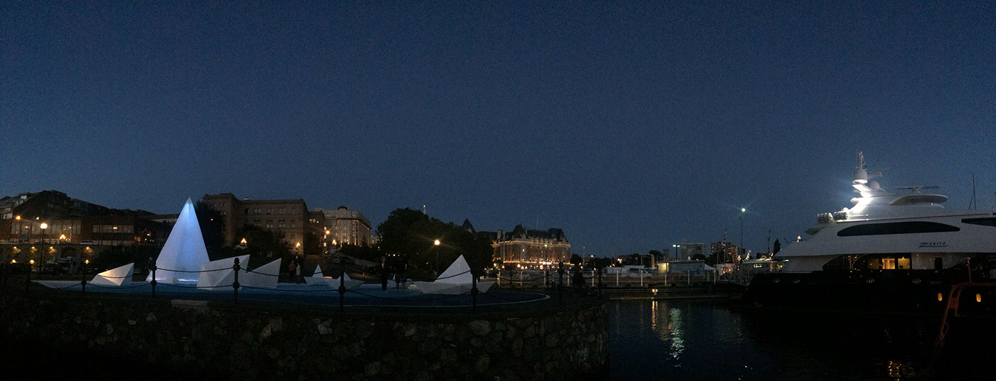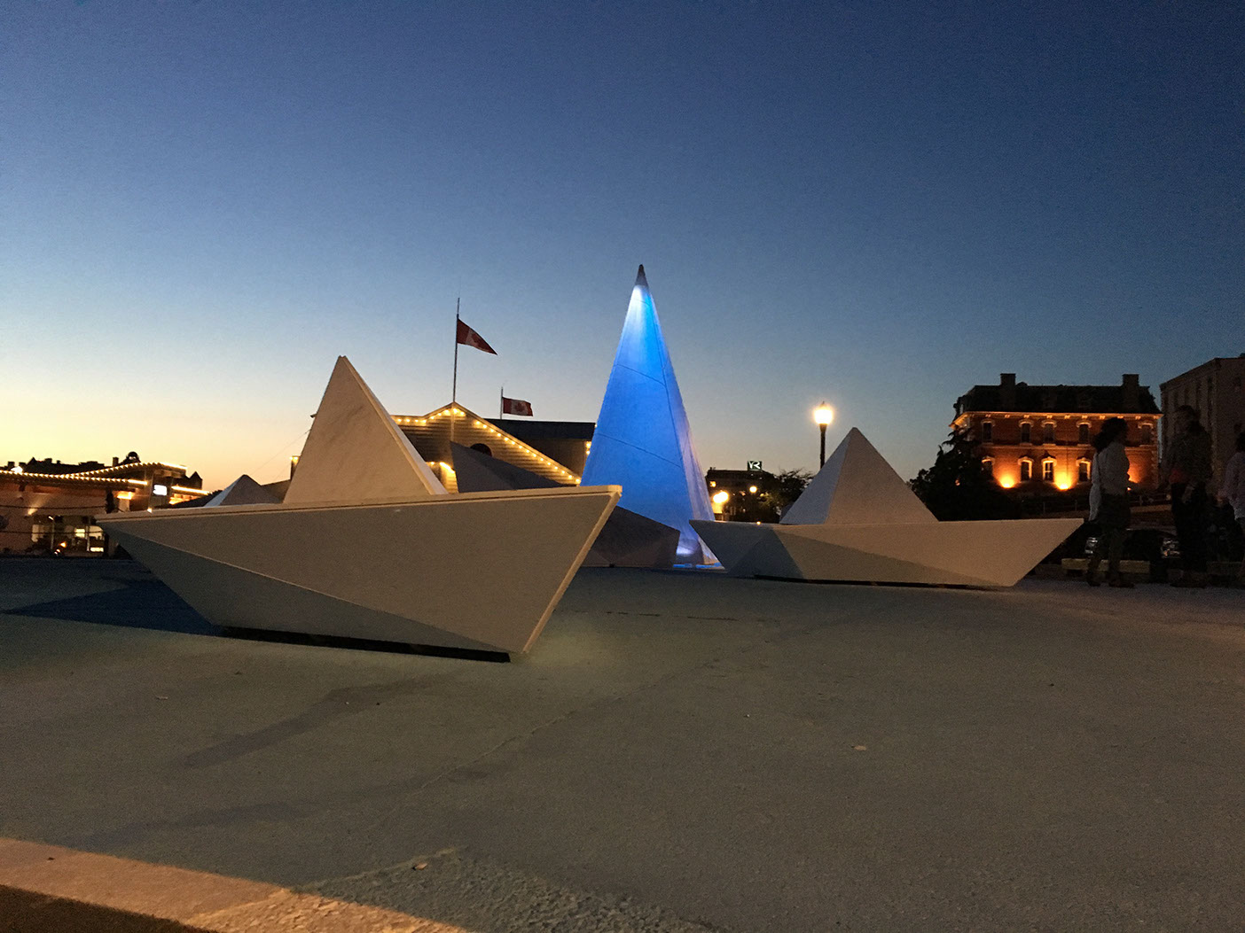 Lighting subtly changes over the course of the night. Individually controlled LEDs project an image onto the sail fabric of the beacon, making it visible from street level and from across the harbour.